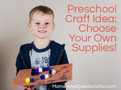 Next, I told him he could choose 4 supplies that he could use to make his craft. I chose 4 because he is 4 so that’s obviously his favorite number. ;) I told him he could choose any supplies he wanted: paper, glue stickers, dot markers, glitter glue, popsicle sticks, straws, etc. He chose watercolor paint, markers, glitter glue, and some pompoms.