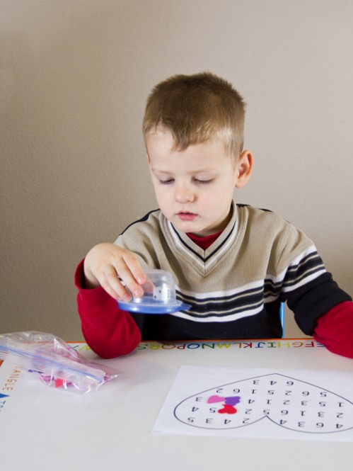 Do you remember that awesome Gingerbread Man Math printable that was all over Pinterest around Christmas. Well, I decided to recreate this dice game for Valentine’s Day. First, we printed the Numbered Heart Printable, got our dice, then I opened a bag of Valentine’s stickers from the dollar store.